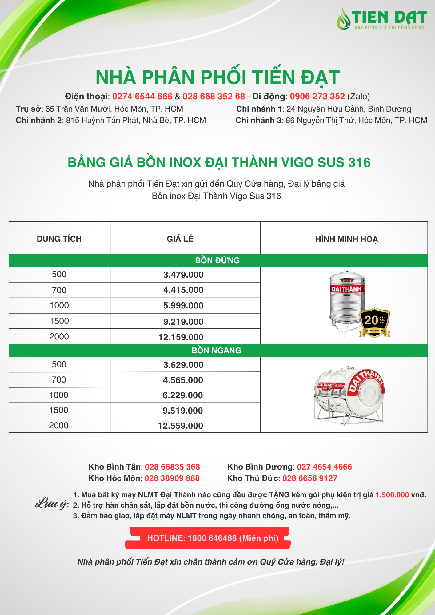 Hiện nay giá bồn nước inox Đại Thành cụ thể như sau: